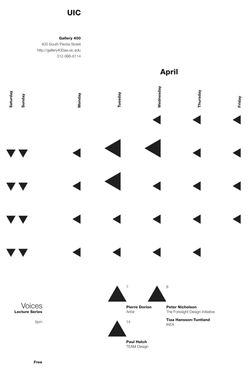 of the month are highlighted. These specific days represent events that are taking place. The entire month is visually illustrated using triangles, typography, and two colors.
